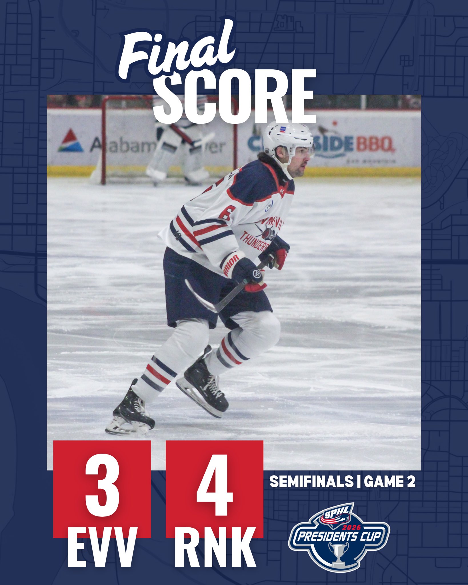 Evansville, In.:  Down but never out, the Thunderbolts rallied from 1-0 and 3-1 deficits in the third period to force overtime, where Isaac Chapman’s goal won the game and the series for Evansville by a 4-3 final score on Sunday afternoon.  Game three in the best-of-five semifinal series against the Roanoke Rail Yard Dawgs at Ford Center will be on Wednesday, April 22nd, face-off at 7:00pm CT.