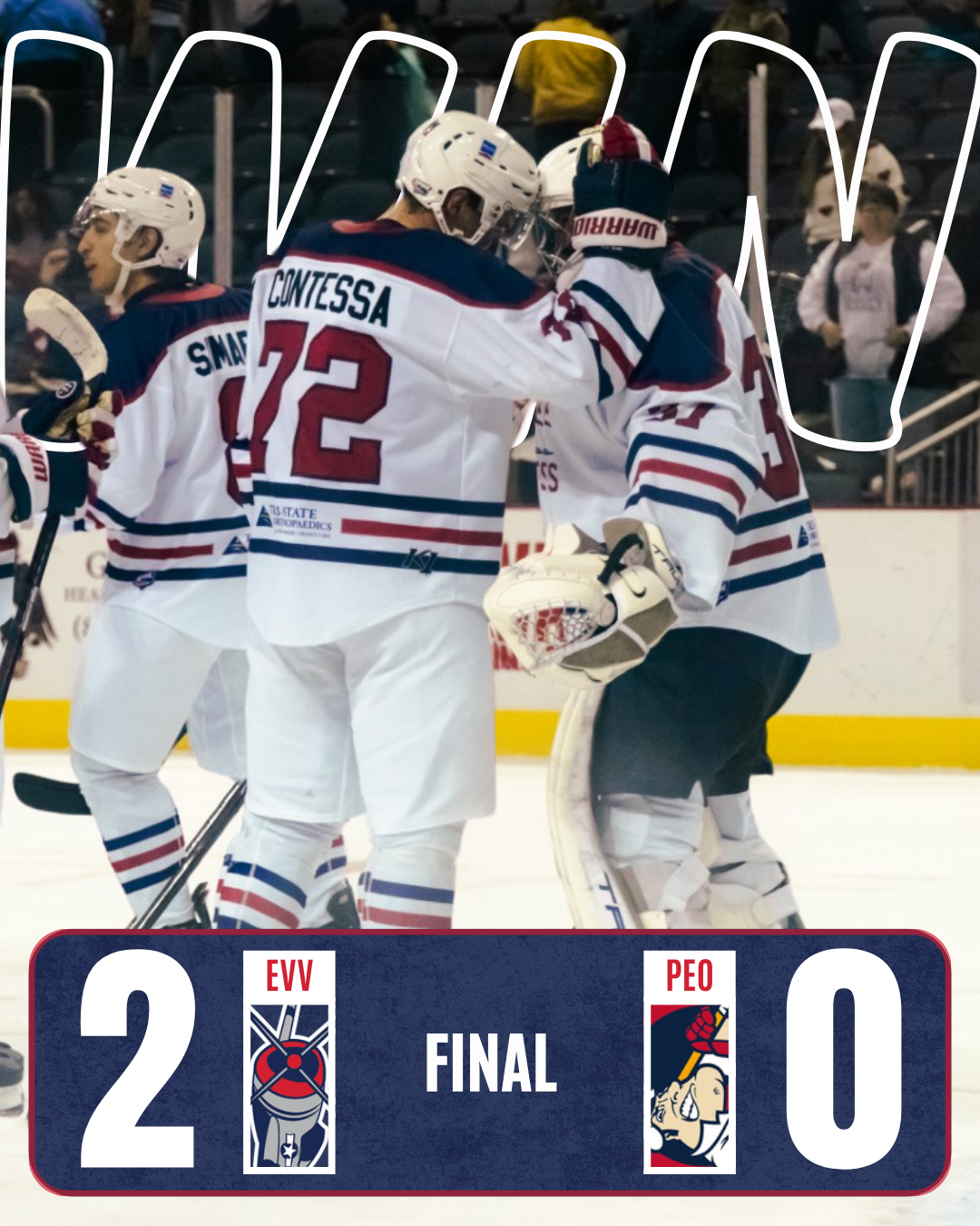The first period was low event, with Evansville killing off the only Rivermen power play and outshooting Peoria 12-9. Early in the second period at 3:28, Evansville struck first as Evan Miller banked a shot off an off-balance Nick Latinovich and into the net, assisted by Matt Clark and Keanan Stewart to give Evansville the opening lead. In the third period, Evansville again shut down nearly every Peoria attack, holding Peoria to only 6 shots on goal in the final frame. As the Rivermen pulled Latinovich late for an extra attacker, the Thunderbolts were rewarded with exactly a minute to go as Derek Contessa scored into an empty Rivermen net to extend Evansville’s lead to 2-0, with Scott Kirton picking up an assist.