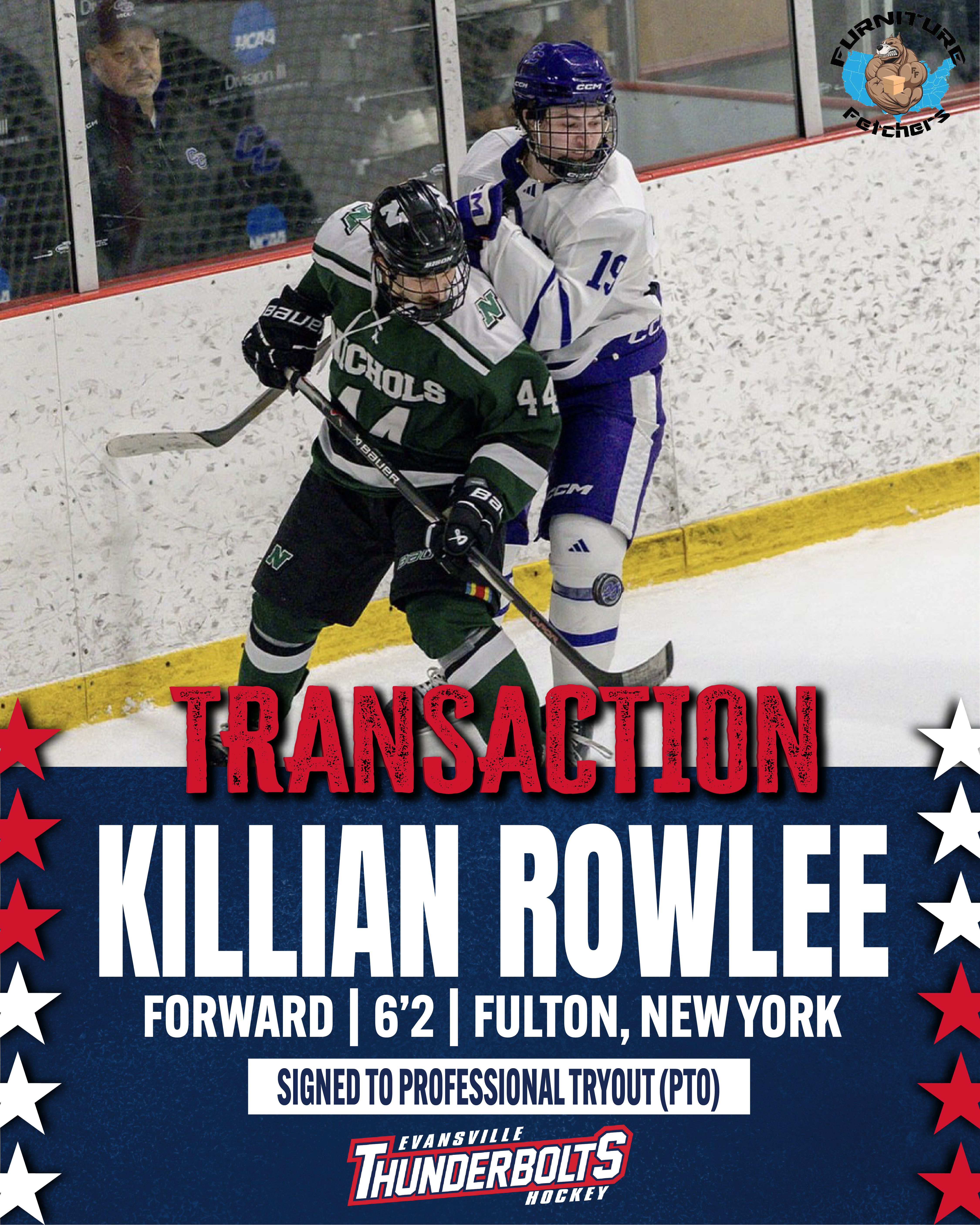 Rowlee joins the Thunderbolts following the conclusion of his collegiate career at Curry College, where he was teammates with Thunderbolts rookie forward Eelis Laaksonen for three seasons between 2022-2025 and together were members of Curry's 2024-25 CNE Conference Championship team. Over 4 seasons of D3 collegiate hockey between 2022-2026, Rowlee scored 35 goals and 52 points in 83 regular season games, including a team-leading 14 goals along with 19 points in 23 games this season, his 19 points tied for second-most on the team. The native of Fulton, New York played a full season of Junior A hockey with the OJHL's Lindsay Muskies in 2021-22 prior to enrolling at Curry College, scoring 14 goals and 25 points in 53 games.