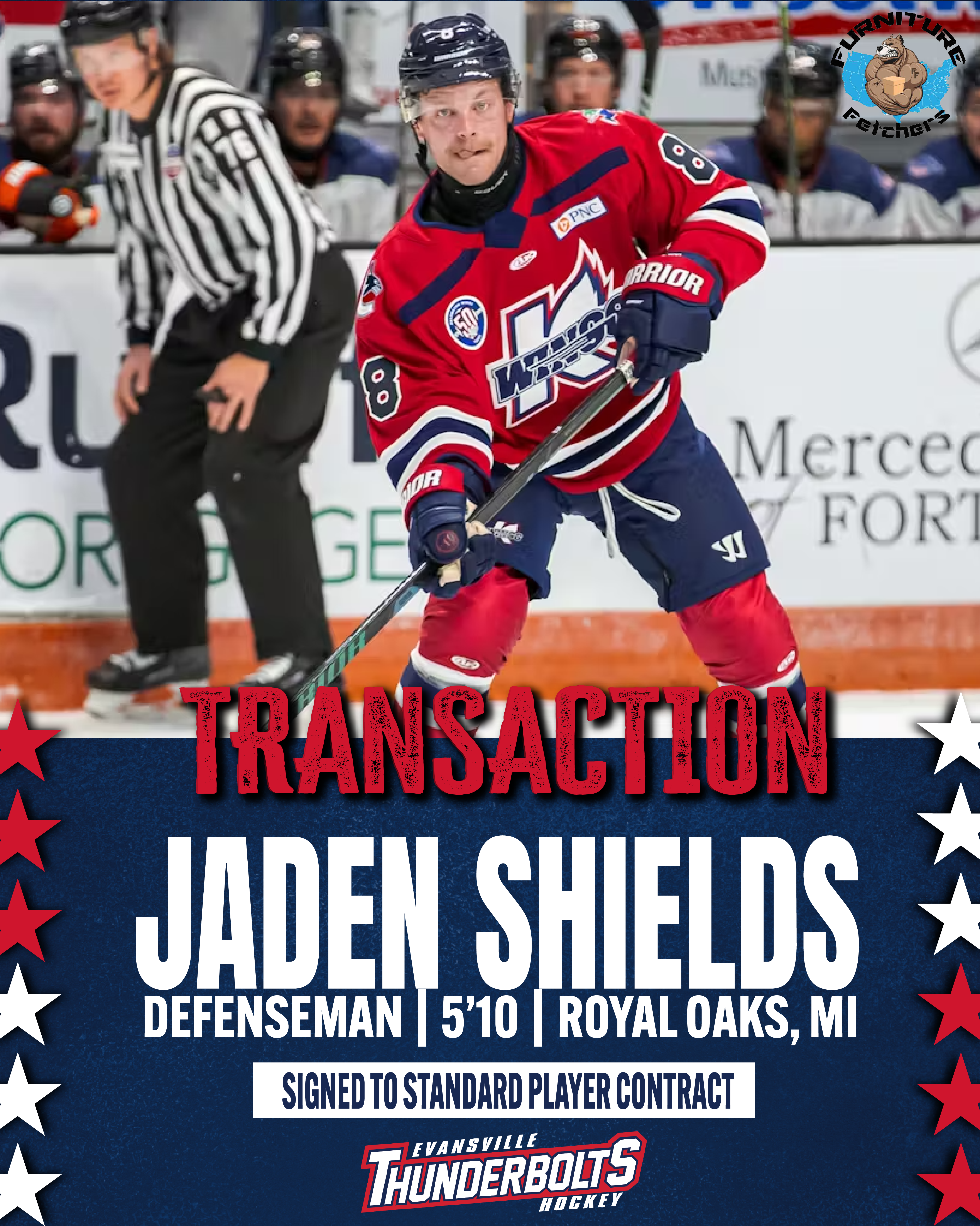 On Tuesday, the Thunderbolts and Head Coach/Director of Hockey Operations Jeff Bes announced a pair of transactions, led by the signing of defenseman Jaden Shields to a standard contract.