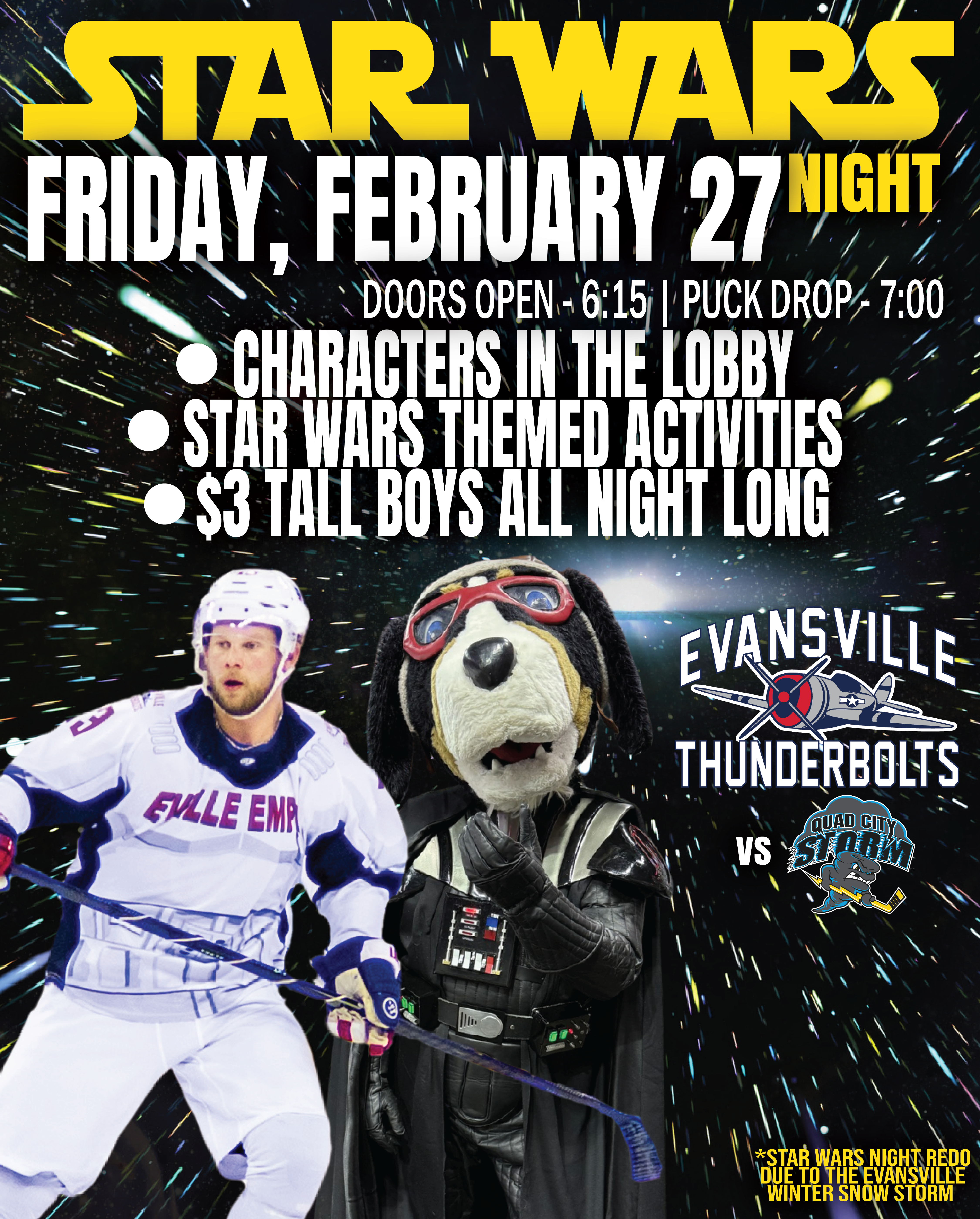 Evansville, In.: Due to the winter storm that has recently hit Evansville, the Thunderbolts are happy to announce a new Star Wars Night that will be added to the Friday, February 27 game against the Quad City Storm. Puck drop is set for 7:00 pm CST. Doors open to the general public at 6:15 pm CST.Â