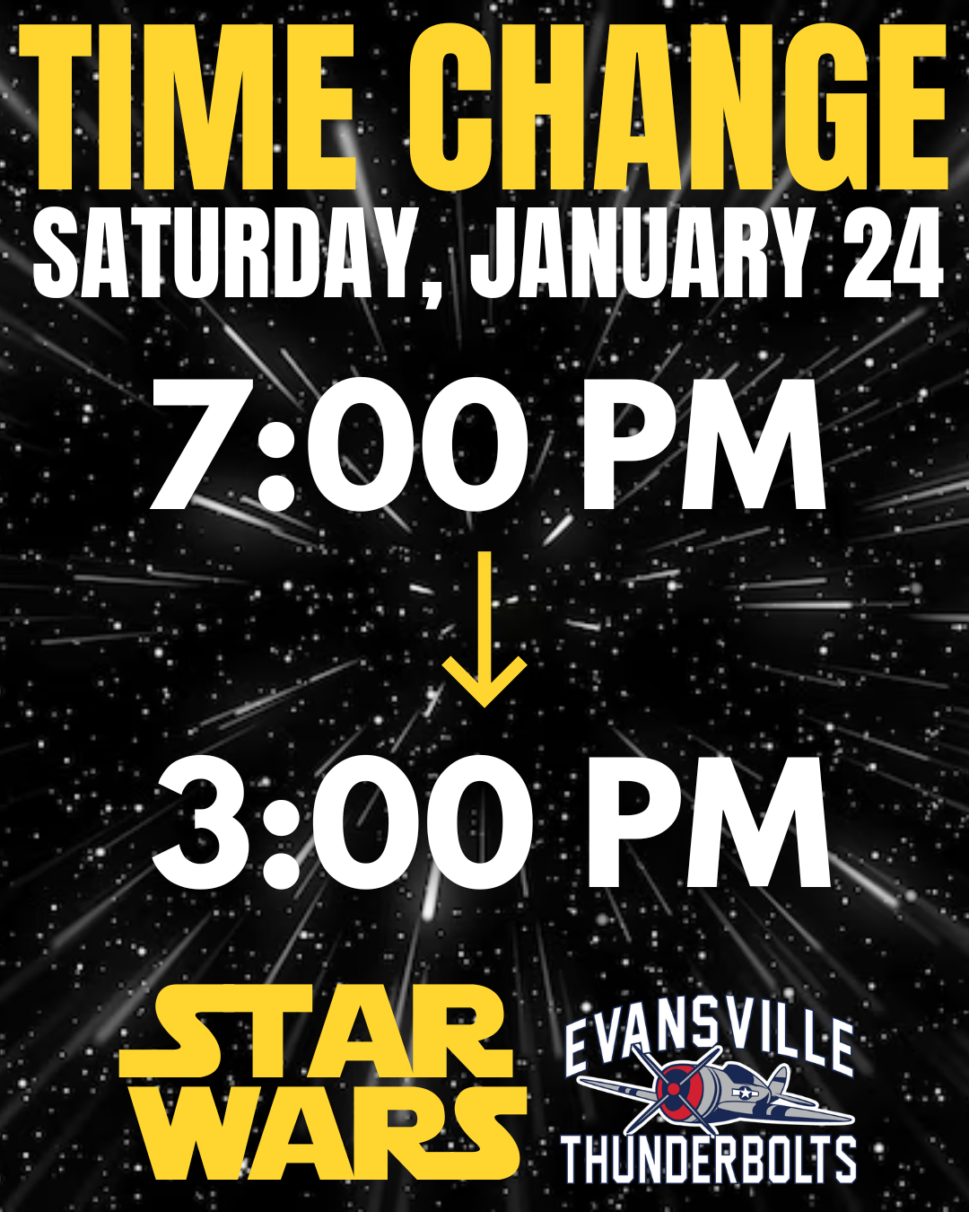 Evansville, In.:  Due to the heightened risk of inclement winter weather, the opening face-off for this Saturday’s game at Ford Center between the Evansville Thunderbolts and Quad City Storm has been moved up from 7:00pm to 3:00pm CT. Opening face-off for this Friday’s home game against the Birmingham Bulls remains unchanged at a 7:00pm CT opening face-off.