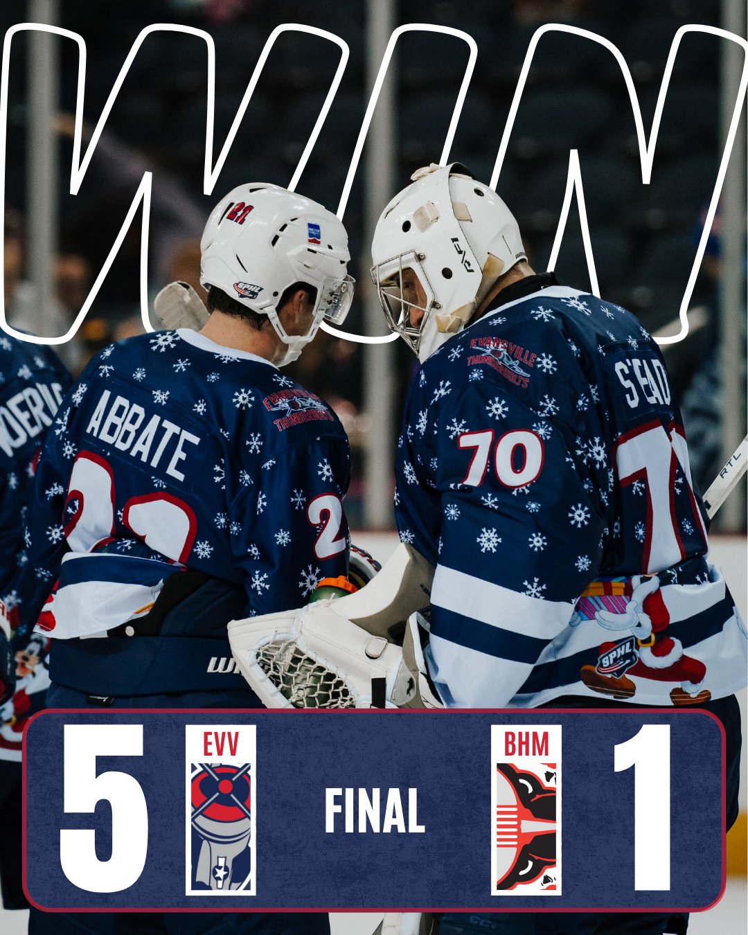Evansville, In.:  After Friday’s tough loss to Macon, the Thunderbolts responded well, soundly defeating the Birmingham Bulls 5-1 at Ford Center on Saturday night and taking 3 out of 4 possible points on the weekend.  The Thunderbolts’ next home game at Ford Center will be on Saturday, December 20th against the Peoria Rivermen at 7:00pm CT.