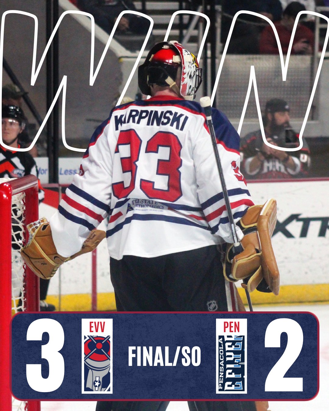 Pensacola grabbed the game’s first lead late in the first period, with Tyler Burnie scoring on a back-door pass at 15:50. 48 seconds later, the Ice Flyers doubled their lead to 2-0 as Zack Jones scored on a 2-on-1 rush at 16:38. Evansville’s trend of strong second periods continued, starting with Connor Tait batting in a puck at the side of the net from Eelis Laaksonen and Will van der Veen at 7:41 to trim the deficit to 2-1 Pensacola. On the power play late in the period, the Thunderbolts nearly fell behind 3-1 with a shorthanded 2-on-0 rush by Pensacola as Tyler Burnie passed across to Tyler German, but a sure goal was robbed by Karpinski, who dove across to make the pad save. The save proved to be a massive momentum swinger, as Evansville scored one second after the power play expired to tie the game 2-2, with Berkopec scoring the goal from Myles Abbate at 17:11. After a scoreless third period and overtime, where Karpinski again denied a 2-on-0 scoring chance, the game went to a shootout. Behind goals in the first round by Scott Kirton and fourth round from Abbate and another 4 saves on 5 shootout attempts by Karpinski, Evansville ended their losing streak of five consecutive shootouts and completed the comeback, 3-2 the final score to open the weekend doubleheader at Pensacola.