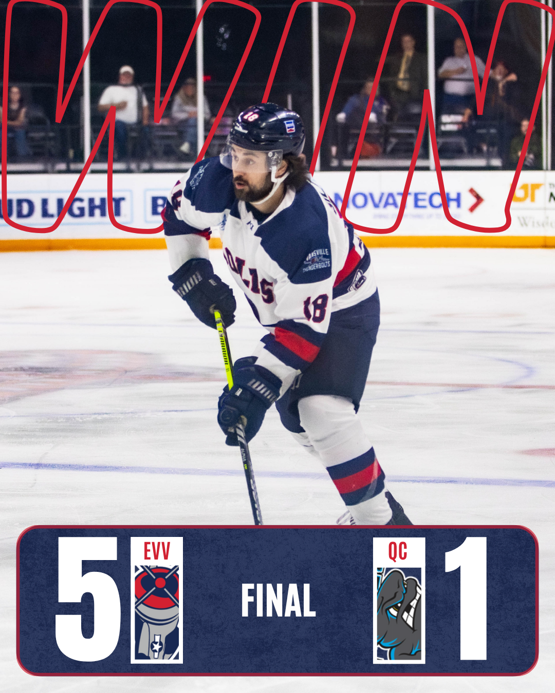 The first period was a back-and-forth affair, with the first goal scored by Evansville’s Will van der Veen at 10:08, assisted by Matthew Hobbs and Jordan Simoneau. Quad City responded shortly afterward at 12:32 as Donte DiPonio scored to tie the game 1-1. Following a massive open-ice hit by Jordan Simoneau on Quad City’s Dmitri Toporowski late in the first period, two fights broke out as Simoneau was challenged by Tommy Tsicos, while Hobbs squared off against Nick Pennucci. The Thunderbolts held strong in the second period and took the 2-1 lead at 11:29 as Kirton scored off the rush from Matt Clark, the lead expanded by Kirton to 3-1 just over two minutes later at 13:54 off a rebound from Isaac Chapman and Gilmour. In the final minute of the second period, Gilmour scored his goal on the power play with a shot that snuck through goaltender Luke Lush, assisted by Clark and Simoneau at 19:33 to put Evansville ahead 4-1 after two periods. After killing three penalties to start the third period, Evansville put the game on ice at 13:17 as Derek Contessa wired a shot home to make it 5-1, assisted by Cameron Patton and John Woernle.
