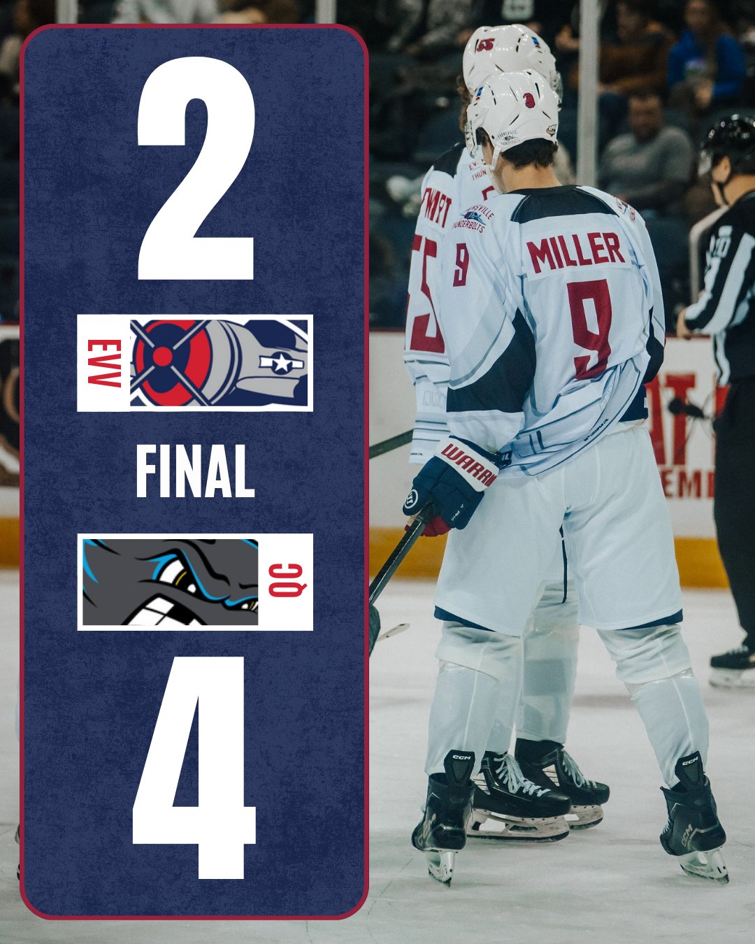 Evansville, In.: After a difficult second period in which Evansville trailed 4-0, the Thunderbolts got halfway back in the third period but fell short, 4-2 the final score against Quad City on...