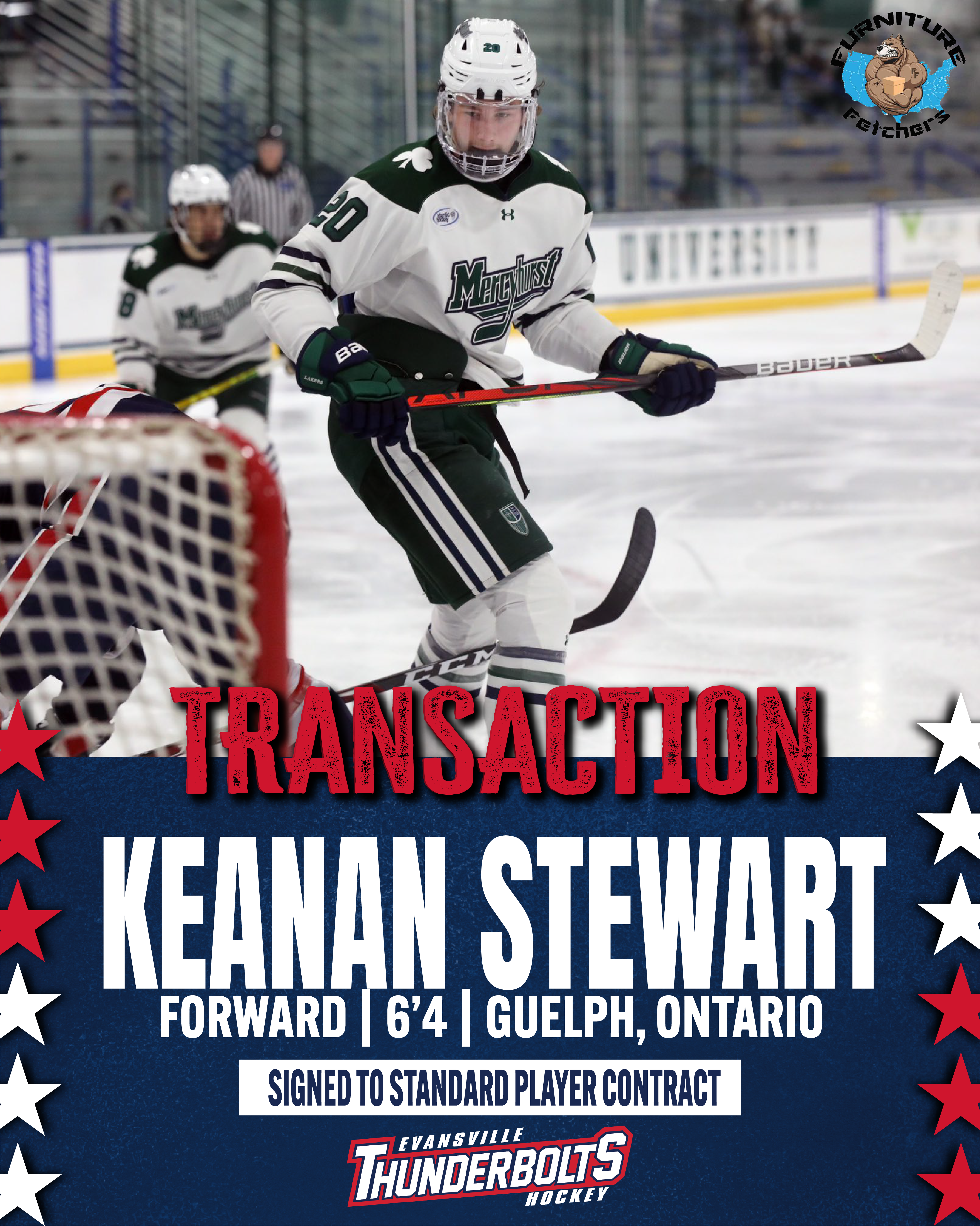 On Wednesday, the Thunderbolts and Head Coach/Director of Hockey Operations Jeff Bes announced a pair of transactions, led by the signing of forward Keanan Stewart to a standard contract.