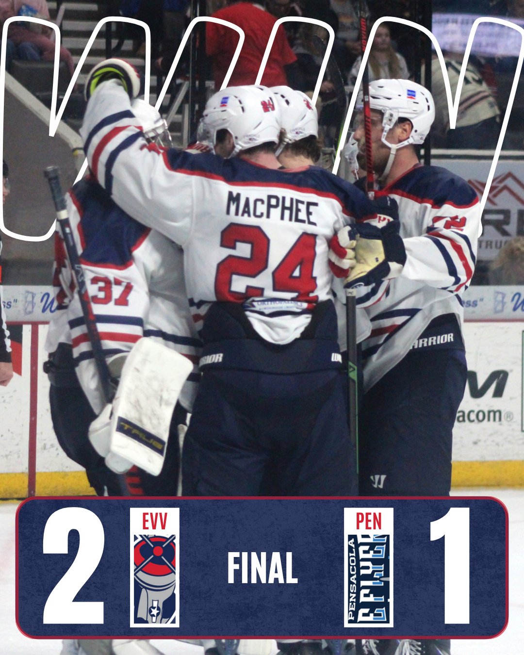 The Thunderbolts dominated the Ice Flyers in the first period, outshooting Pensacola 14-3 and scoring the only goal of the period as Derek Contessa scored on a 2-on-1 rush from Myles Abbate at 12:29. In the second period, the Ice Flyers pressed hard and tied the game at 4:05 as Tyrone Bronte scored on a net-front pass. Evansville bent but didn’t break for about 10 minutes afterward as Pensacola pressed, before bouncing back to retake the lead at 15:34 as Eelis Laaksonen scored at the net-front from Evan Miller and Contessa to make it 2-1 Evansville. The Thunderbolts shut down the Ice Flyers on their only power play chance in the game midway through the third period and denied Pensacola any significant opportunities with goaltender Logan Flodell pulled for an extra attacker late, as Evansville secured the 2-1 victory, taking both games in their only trip to Pensacola this regular season.