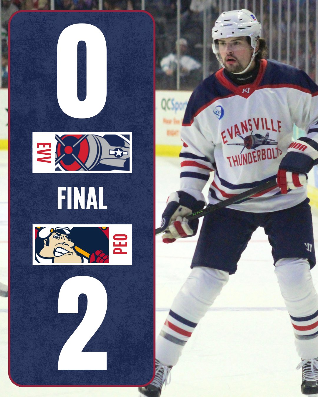 Peoria, Ill.: Thursday morning’s game in Peoria was a low-scoring one, in which Evansville could not build off a strong start with a goal, as the Thunderbolts were defeated 2-0 by the Rivermen. The Thunderbolts’ next home game at Ford Center will be on Saturday, December 20th against the Peoria Rivermen at 7:00pm CT.