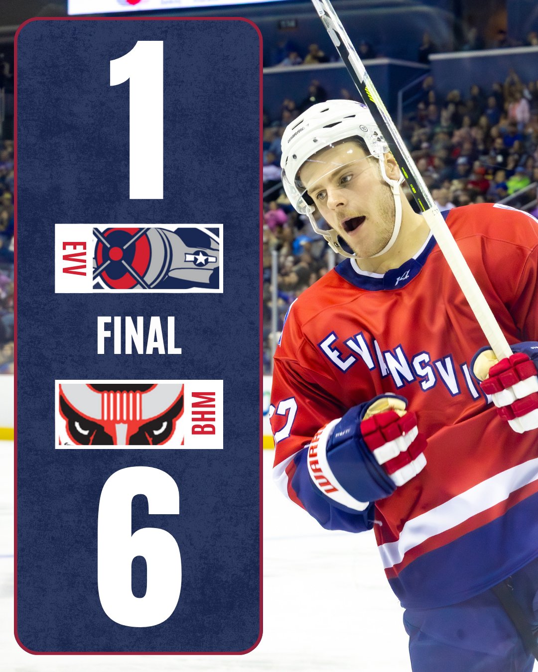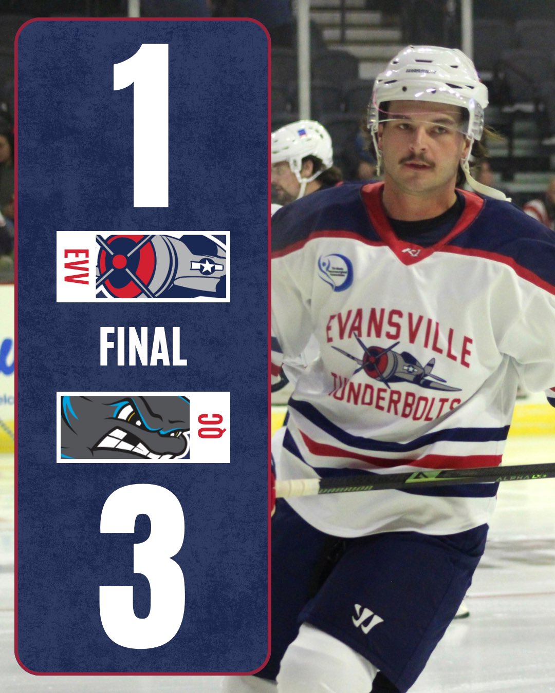 Tait scored Evansville’s goal while Kristian Stead stopped 19 of 25 shots on goal, which should be heavily emphasized that virtually all of the goals against Stead were on very difficult Grade-A opportunities. The Thunderbolts and Bulls meet again on Friday, January 23rd at Ford Center, with Evansville leading the season series 2-1.