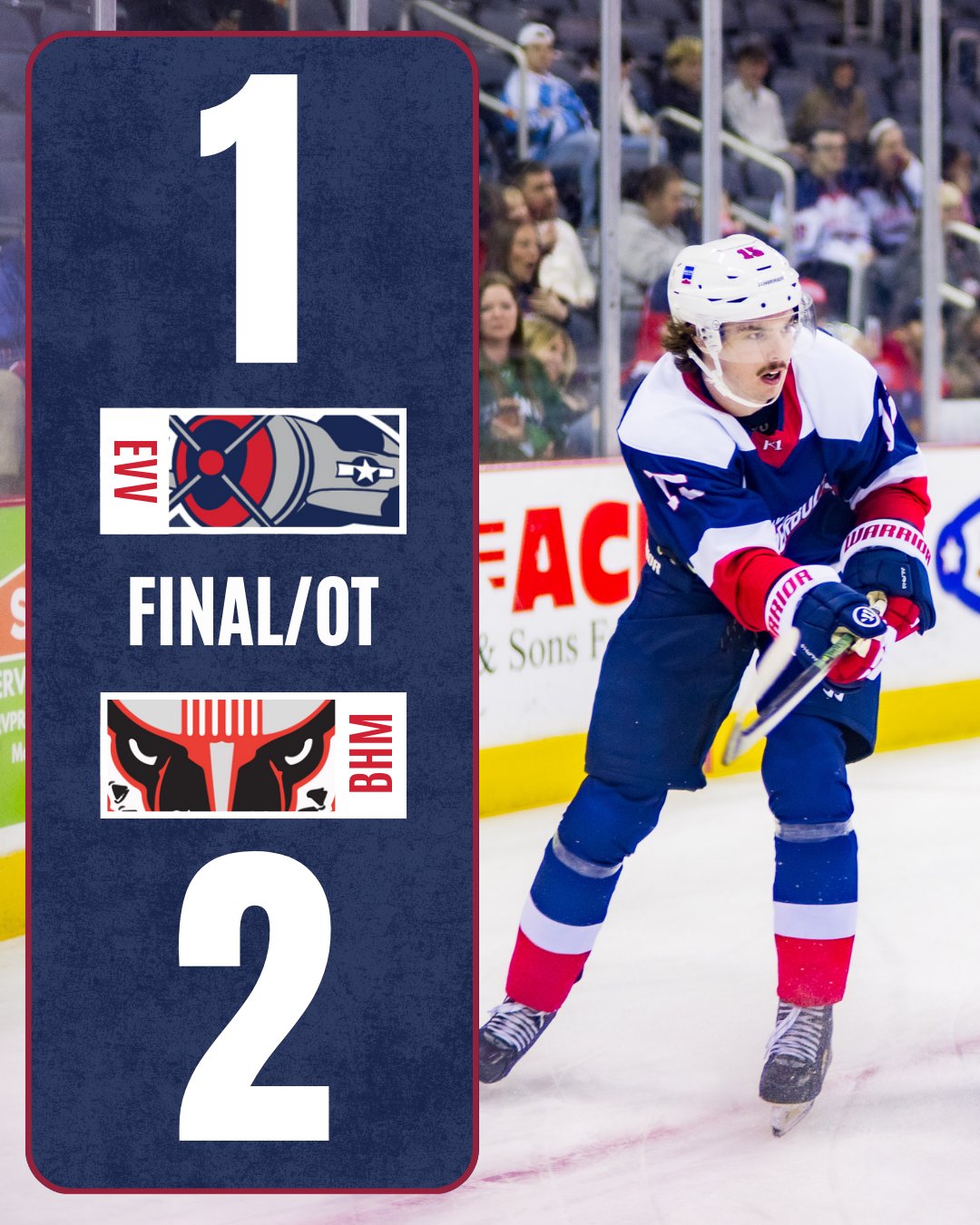 Evansville grabbed the first lead of the game only 5:42 in, as Scott Kirton deflected a shot on a power play to make it 1-0 Evansville, assisted by Tyson Gilmour and Keanan Stewart. In the second period, Drake Glover tied the game 1-1 for the Bulls, scoring on a back-door pass from Danny Weight on the rush. Shortly after the Bulls tied it, Kristian Stead was run by Birmingham’s CJ Walker, drawing a response from Evansville skaters as well as Stead himself, his involvement drawing the attention of Bulls goaltender Hayden Stewart at the other end of the ice, and both goaltenders decided to duke it out at center ice in the Thunderbolts’ first-ever goalie fight which saw Stead knock Stewart to the ice three times. The game remained tied 1-1 despite the Thunderbolts outshooting Birmingham 26 to 9 since the goalie fight, before the Bulls won the game in overtime on a power play goal by Weight at 1:32, as the Bulls’ goaltending tandem of Stewart and Talor Joseph stole the game for Birmingham.