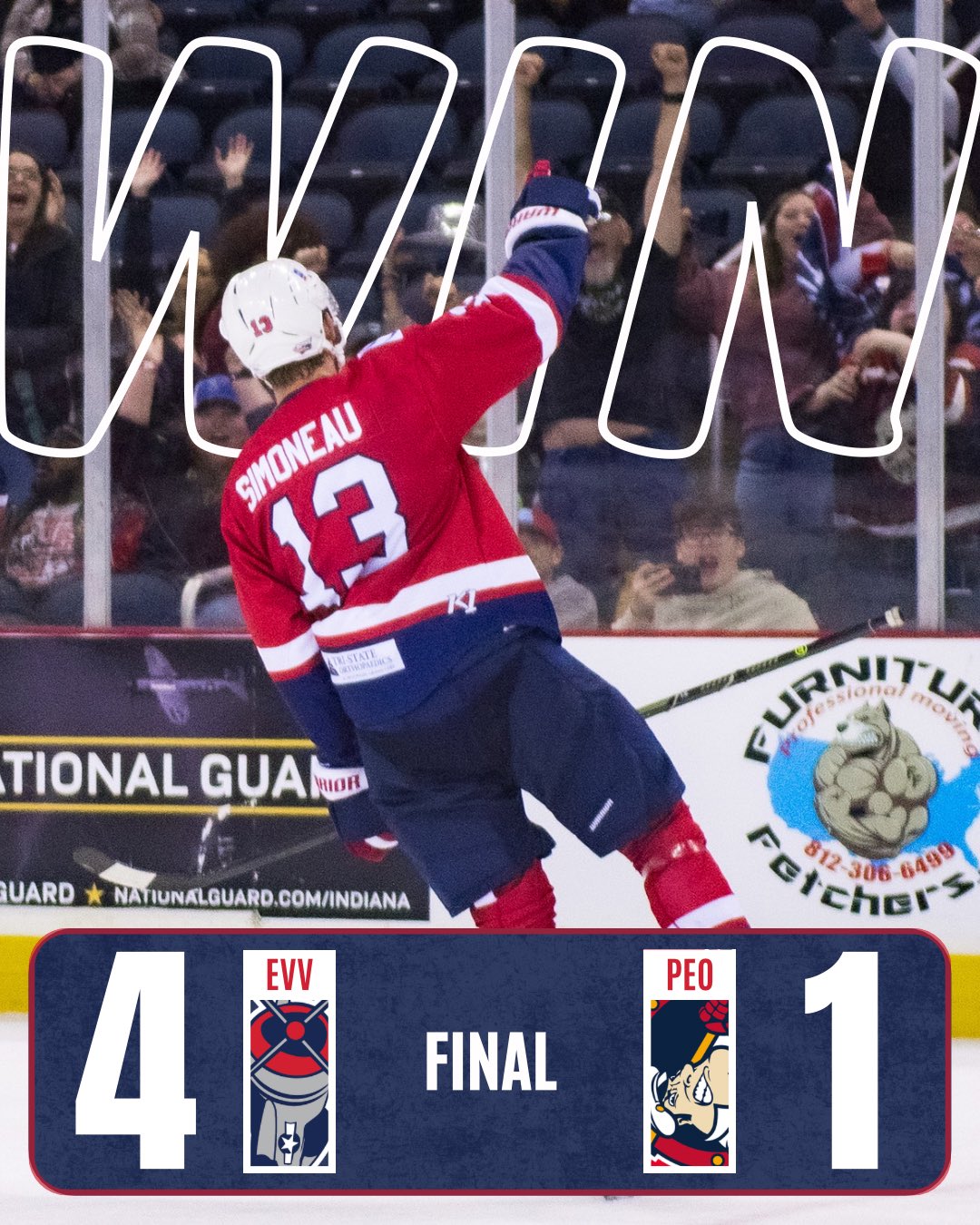 Evansville, In.:  Behind goals from Jordan Simoneau and Connor Federkow along with a collective defensive effort that held Peoria to only 23 shots on goal, the Thunderbolts defeated the Rivermen 2-1 on Friday night at Ford Center.  The Thunderbolts’ next home game at Ford Center will be on Saturday, November 1st against the Peoria Rivermen at 7:00pm CT.
