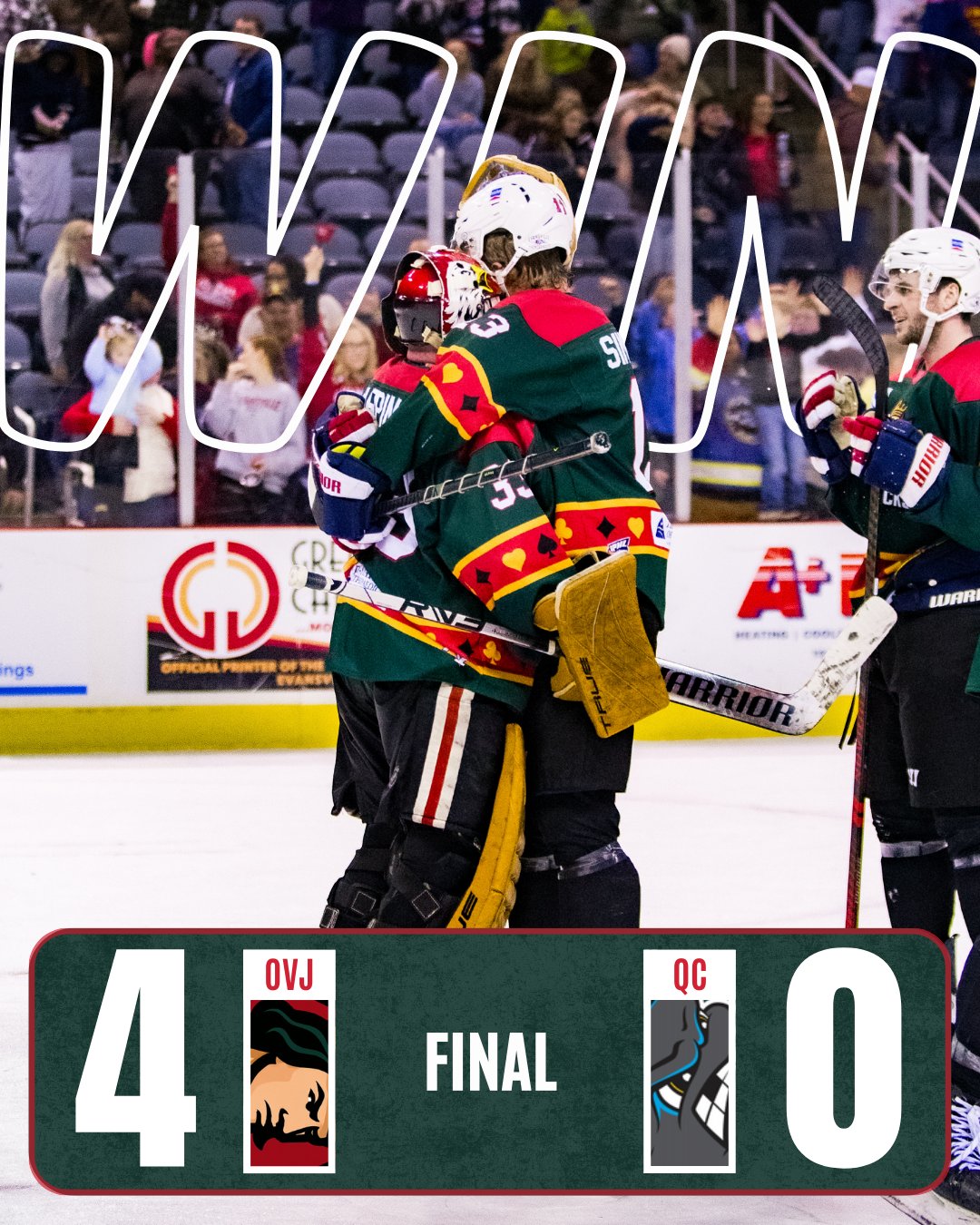 The first period was relatively uneventful, as Myles Abbate nearly scored on the rush midway through the period, but hit the post. The offense roared to life in the second period as Joey Berkopec scored on the rush from Scott Kirton and Connor Tait only 31 seconds in to give Evansville a 1-0 lead.  At 7:11, excellent forecheck pressure led to Tyson Gilmour finding Kirton at the net front to make it 2-0, also assisted by Berkopec. After holding at 2-0for a long stretch going midway into the third period, Abbate scored on nearly the same play that hit the post earlier, shooting off a beautiful 2-on-1 setup from Isaac Chapman to make it 3-0, with Evan Miller getting the secondary assist by starting the rush out of the Evansville zone. With only 3:10 remaining, Evansville capitalized on a power play to make it 4-0 as Jordan Simoneau scored on a net-front redirection from Abbate and Kirton.