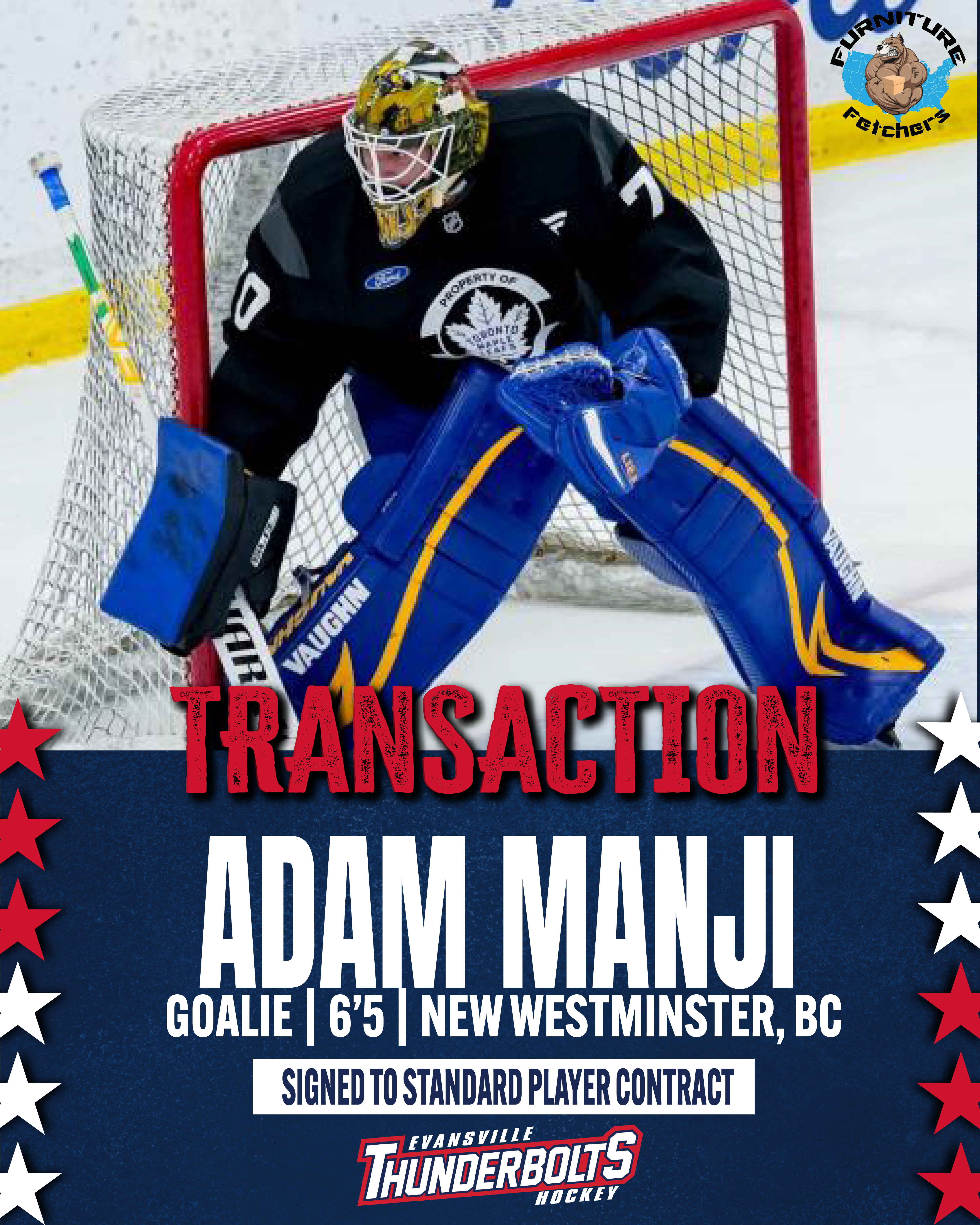 Prior to Friday's game against Macon, the Thunderbolts and Head Coach/Director of Hockey Operations Jeff Bes announced several transactions, led by the signing of goaltender Adam Manji to a standard contract, as well as the activations of Dilan Peters and Connor Tait from Injured Reserve.