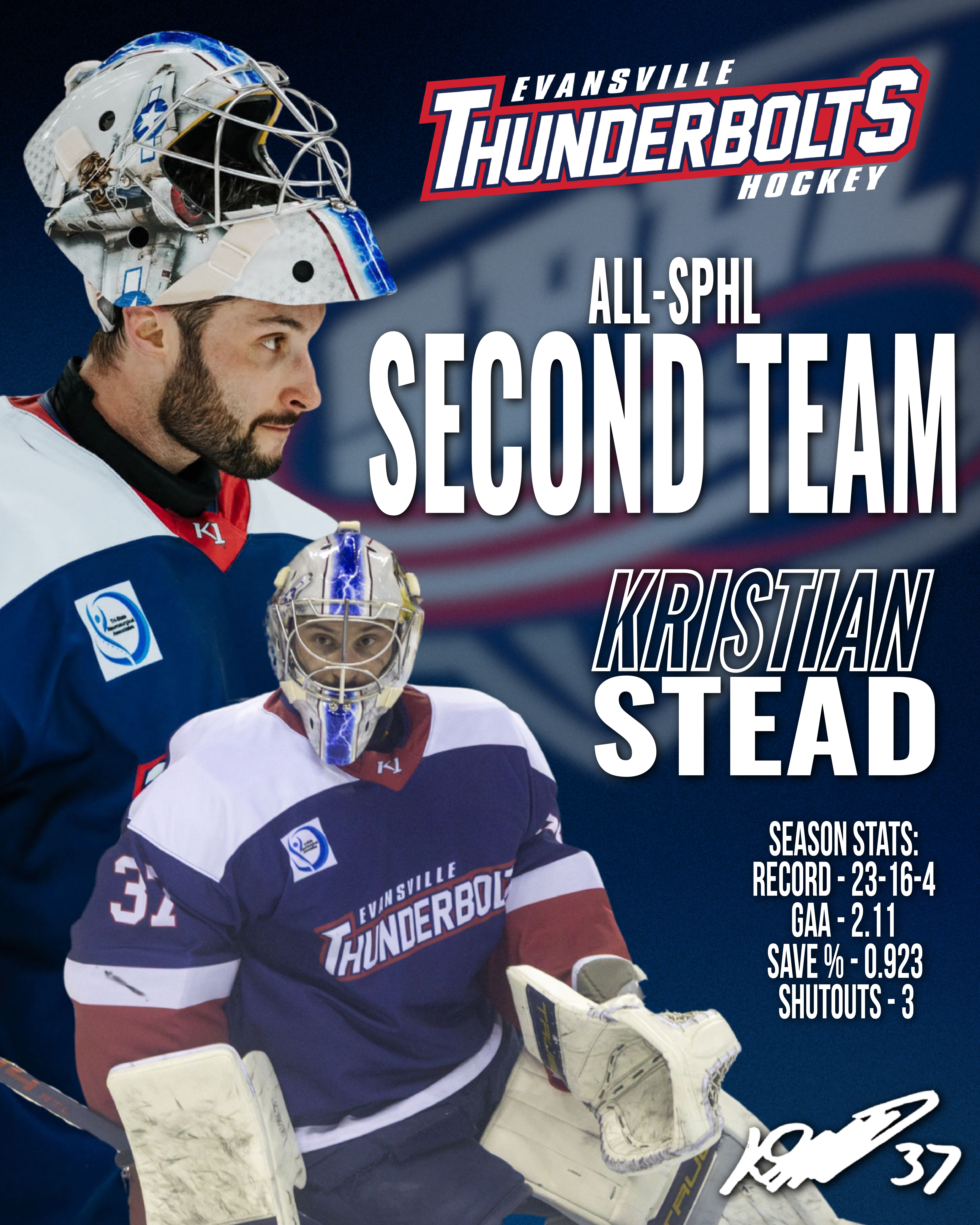 Kristian Stead of the Evansville Thunderbolts was second in the SPHL in wins (23) and minutes played, third in goals against average (2.11), and fourth in saves. Stead also finished fifth among goaltenders with three shutouts and was sixth with a 0.923 save percentage.