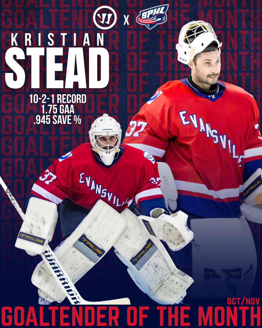 HUNTERSVILLE, NC (December 3, 2025) - The SPHL announced today that Kristian Stead of the Evansville Thunderbolts has been named the inaugural Warrior Hockey SPHL Goaltender of the Month for October/November.