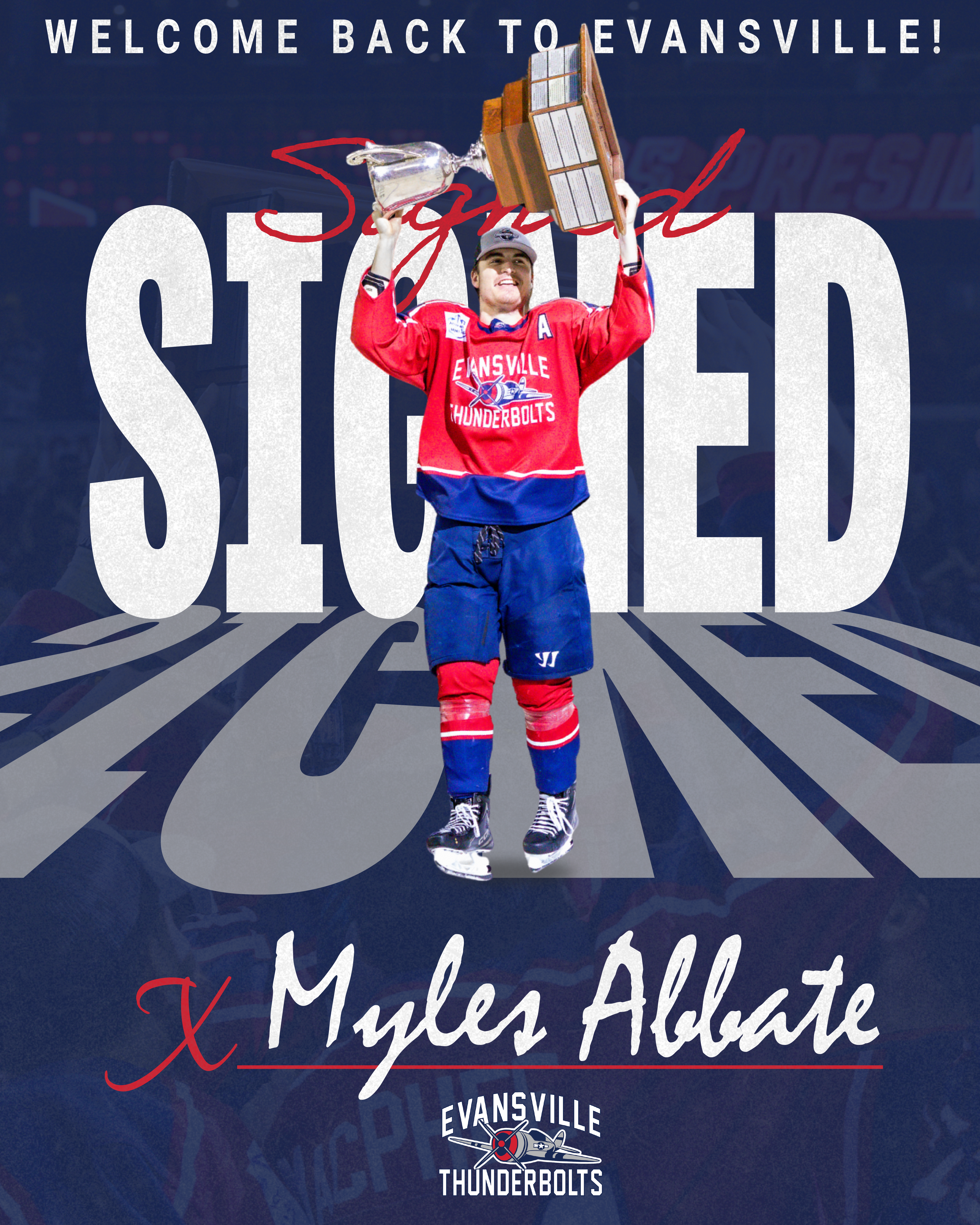 Evansville, In.: The Evansville Thunderbolts and Head Coach/Director of Hockey Operations Jeff Bes are pleased to announce the re-signing of forward Myles Abbate for the 2025-26 season. The...