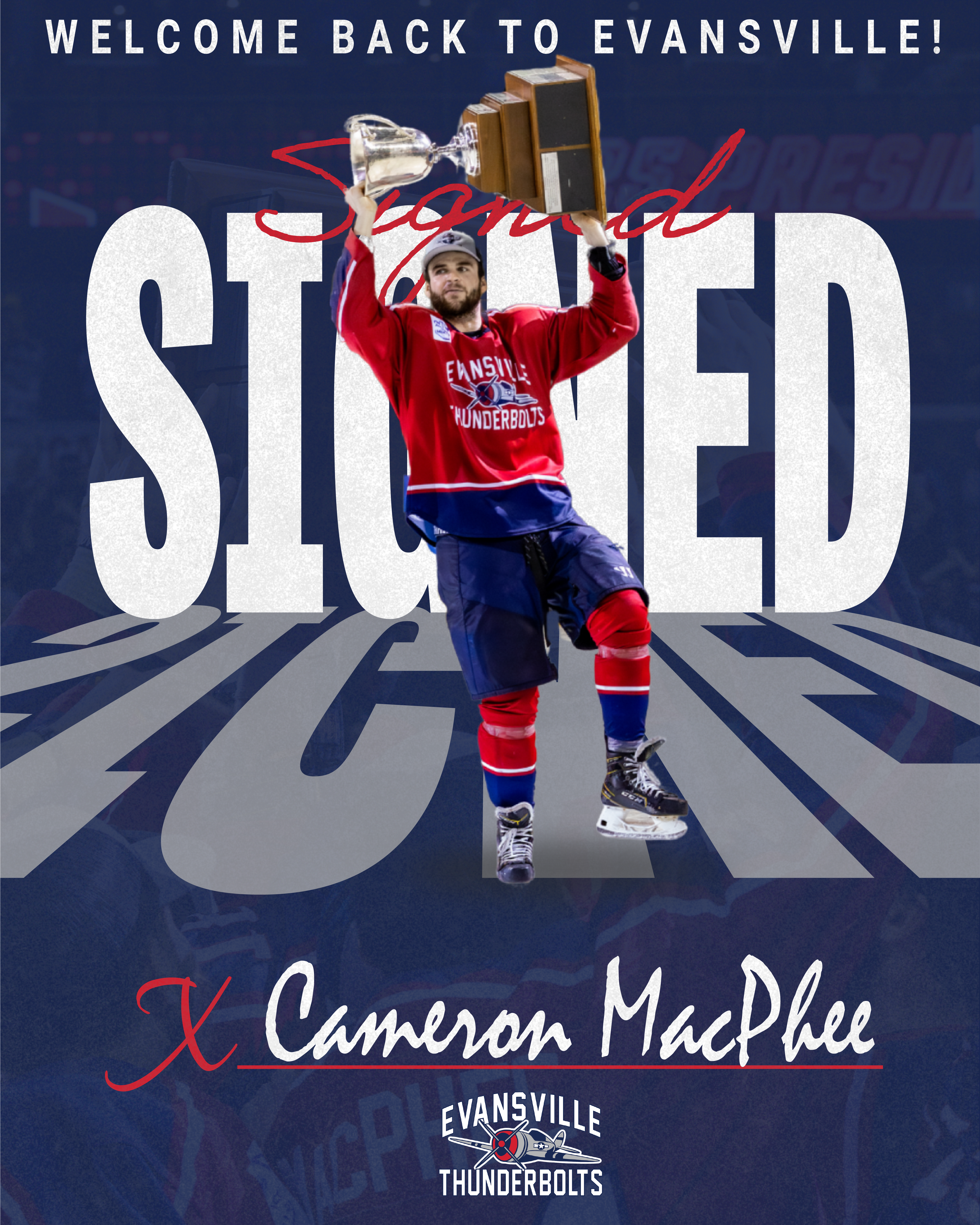 Evansville, In.: The Evansville Thunderbolts and Head Coach/Director of Hockey Operations Jeff Bes are pleased to announce the re-signing of defenseman Cameron MacPhee for the 2025-26 season. The...